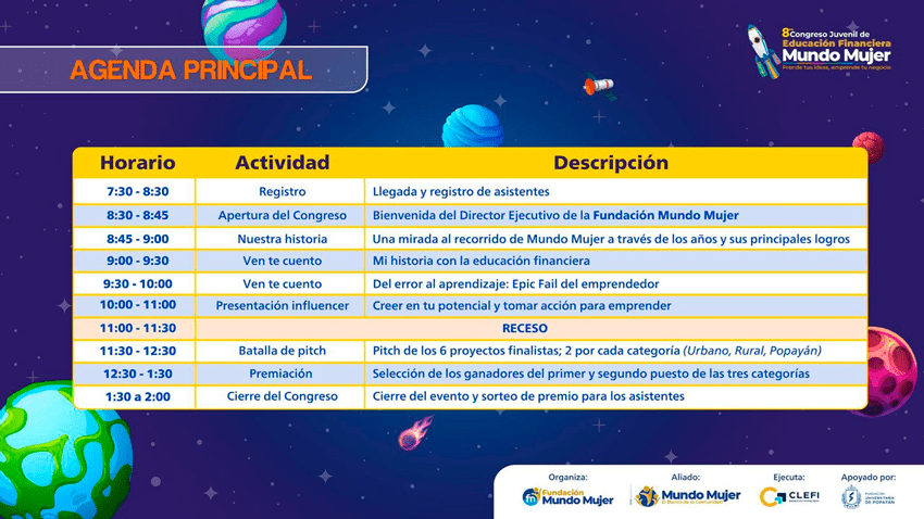 El Congreso Juvenil de Educación Financiera Mundo Mujer es una experiencia única que combina inspiración, aprendizaje y acción. A través de este espacio, la Fundación Mundo Mujer reafirma su compromiso con la formación de jóvenes líderes capaces de transformar su entorno, impulsar sus ideas y contribuir al progreso de sus comunidades.