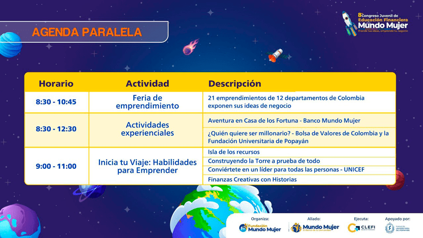 El Congreso Juvenil de Educación Financiera forma parte del Proyecto de Educación Económica y Financiera en 40 Instituciones de Colombia, desarrollado en el marco del eje Educación para el Progreso de la Fundación Mundo Mujer.